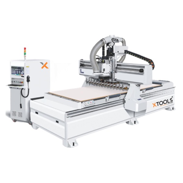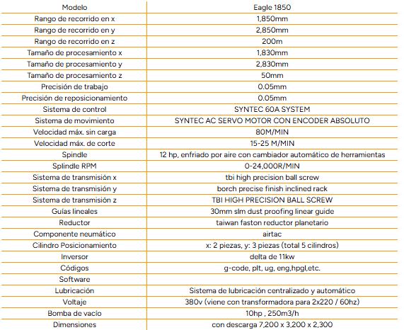 El centro de mecanizado de 6 cebras tiene como funciones principales el taladrado, ranurado, fresado y corte. Tiene un control CNC Taiwán LNC para monitoreo completo, estructura rígida y guías lineales para precisión, mesa flotante y pinzas para alimentación suave, motorreductor japonés para movimientos estables, sistema de medición automática de tableros y servomotores Innovance para precisión, velocidad y estabilidad.