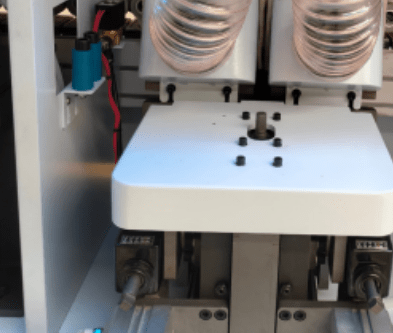 Cuenta con el dispositivo bloqueo mecánico, Impide que se coloque un tablero a la banda antes que la maquina esté lista, también que se tenga la distancia correcta entre uno y otro tablero.