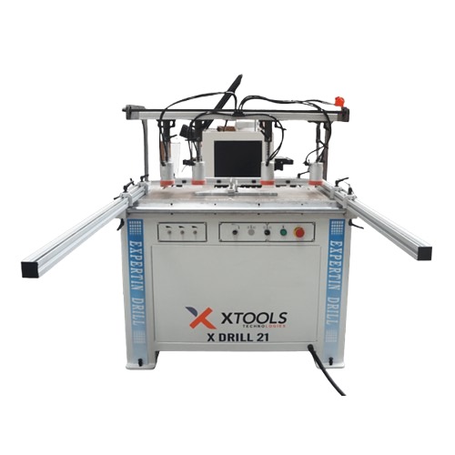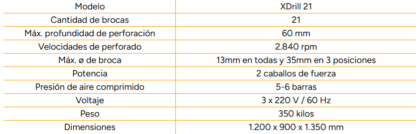 El XDrill es una máquina de perforación versátil, sistema 32, con cambio automático entre posiciones vertical y horizontal, controlado desde un panel frontal intuitivo. Incorpora cilindros neumáticos para el desplazamiento del cabezal y la línea de taladrado, guía lineal para posicionamiento preciso de paneles, y pedal de mando libre para perforación. Incluye juego de acoples rápidos para las brocas.